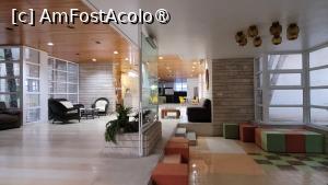 Recepția beneficiază de un hol foarte mare în care se găsesc mai multe canapele, fotolii și măsuțe, iar geamul cu vitraliu (sau desenat - habar n-am) este de mare efect. A fost păstrată și cabina telefonică – nefuncțională desigur – un lucru dreguț zic. La recepție există și un bar însă are niște prețuri foarte mari ca să cred că cineva care alege un hotel ieftin le-ar plăti.