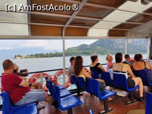 Vaporașele sunt de mai multe dimensiuni, dar toate prezintă o zonă de interior și una sau mai multe punți exterioare, au toalete și, cele mai mari, bărulețe de unde-ți poți cumpăra gustări și băuturi. Vremea nu era chiar grozavă, ne treziserăm sub un cer în mare parte înnorat, soarele se străduia, săracul, dar nu-i prea ieșea (în a doua parte a zilei chiar ne-a plouat un pic). Aveam să mergem cu 4 vase, 3 mici și 1 mare și de fiecare dată am stat afară, pe punte (care este totuși protejată cât de cât). Asta ca să simțim mai bine briza lacului, să admirăm culorile sale mereu schimbătoare, munții din fundal și toate orășelele alea frumoase înșirate pe țărm... Și n-a fost greu deloc să găsim locuri, ba chiar ne-am foit de colo colo pentru un view mai bun, pe măsură ce unii pasageri mai coborau.