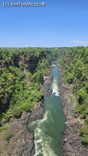 Am trecut acest pod istoric, o adevărată minune inginerească, foarte fericiți de această nouă experiență. Jos, Zambezi curgea întunecat, îngust, concentrat. Fiind în sezonul uscat l-am văzut clar, traiectoria, pereții abrupți ai defileului și felul în care apa dispare în canion, fără ceață, fără mister, dar cu o forță controlată, aproape tehnică.