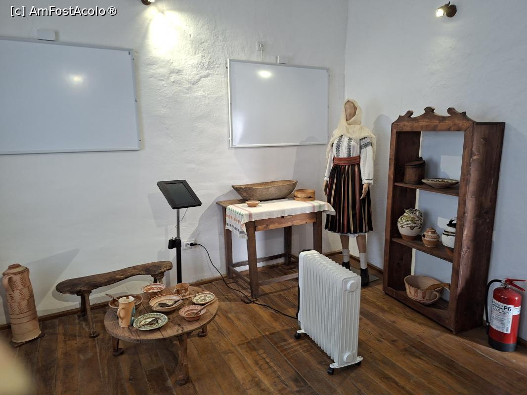 Am ajuns și la etajul doi, cu două săli cu tavane cu grinzi de lemn și aici existau stâlpii protectori. În prima sală era expoziția „Interior de casă tradițională oltenescă” cu odaia de dormit, cu un pat, perne, scoarțe și covoare cu motive oltenești dar și un război de țesut. În a doua sală era expoziția „Interior de bucătărie tradițională oltenească” cu vatra cu ogeac, unde se făcea focul și se cocea pâinea, cu diverse vase de pământ, masa în jurul căreia erau așezate câteva scăunele. Obiecte de lemn, cum sunt lingurile de diferite mărimi și forme, farfurii și blide de lut, ulcioare, toate se regăseau într-o gospodărie din secolul trecut.