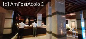 Ajunși în fața hotelului La Mamounia, vizibil emoționați, ne luăm inimile-n dinți și îi întrebăm pe prezentabilii domni de la pază dacă ne pot primi să vizităm puțin interiorul, fiindcă așa mersese vestea că și oamenii de rând ar putea avea acces la vizite limitate. Foarte politicoși, gardienii ne răspund că după orele 11 vom avea acces în perimetrul hotelului, în acel moment fiind cam 10,30. Bucuroși, nevoie-mare, ne mai învârtim nițeluș prin zonă și la 11,00 ne înființăm în fața hotelului, doar că în fața noastră un grup mare de francezi ne-o luase înainte.