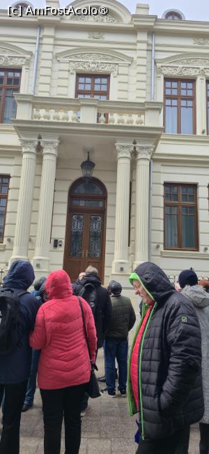 La ieșirea din piață, oprim câteva momente în dreptul Moscheii Carol I, unde ghidul ne spune câteva cuvinte despre istoria acesteia. Ne mutăm, apoi, pe strada Nicolae Titulescu, unde primim alte câteva informații despre Edificiul Roman cu Mozaic. După câțiva pași, pe partea dreaptă, este Casa cu Lei. Este considerată o „clădire simbol” a Constanței, construită la sfârșitul secolului al XIX-lea. Mă așteptam la niște lei impozanți, ce sar în ochi la prima vedere. Dar ei sunt undeva sus, în capul coloanelor ce flanchează intrarea. Dacă nu știi, poți să îi ratezi! Aflăm, cu această ocazie, că era la modă să ai coloane grecești la intrare„era un semn al rangului social. Ultimul proprietar al casei era mare amator de artă și a organizat la parter o expoziție cu lucrări ale unor pictori celebri, care putea fi văzută din stradă.