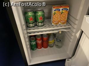 Tot pe aceeaşi parte a camerei se mai afla o piesă de mobilier ca un dulap, un fel de maxi-bar, ca la Astor Garden din Constantin şi Elena, care adăpostea setul de preparare a ceaiului şi cafelei, cu cană electrică pentru încălzit apa, pliculeţe de ceai, cafea instant şi zahăr, căni, sticle de apă, chipsuri, precum şi minibarul. Conţinutul minibarului era destul de bogat, incluzând două sticle de apă plată, două beri Heineken la doză, câte două doze de Coca Cola, Cola Zero şi Sprite, două sucuri de fructe la cutie cu pai, o sticlă de apă minerală şi una de apă tonică Schweppes. Zilnic minibarul era completat cu cele consumate.