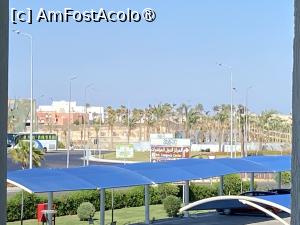 Camera mea se afla la etajul al doilea și ultimul, cred că era penultima la capătul holului şi aveam mult de mers de la lift. Vederea era spre o stradă destul de circulată, spre parcarea hotelului şi spre hotelul de visavis. În plan îndepărtat vedeam şi marea, bonus 😊. Din păcate, încă de dimineaţă, liniştea ne-a fost tulburată de claxoanele insistente şi fără rost ale şoferilor, probabil acesta fiind modul lor de a se saluta între ei. Cu uşa de la balcon închisă, zgomotul era totuşi mult atenuat. Acesta a fost unul din motivele pentru care am solicitat schimbarea camerei cu una pe partea cu piscina şi mai aproape de lift. Cu greu am reuşit schimbarea la prânz în a doua zi de sejur, care a fost de fapt prima :D.