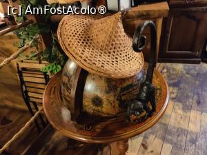 Precum deducem din denumire, conceptul tavernei are strânsă legătură cu lumea pirateriei, iar decorațiunile (multe și haioase) „vorbesc” în acest sens. O să vedeți în poze, deși, din cauza luminii deficitare, acestea n-au ieșit chiar cum aș fi vrut; totuși, puteți să vă faceți o idee. Cranii și falange împrăștiate ici-colo, lăzi cu „comori” și sticle de „rom” , năvoade, parâme și cârme de corăbii și, peste toate acestea, o sumedenie de „pânze de păianjen” . Locul duce cu gândul și la legenda Contelui Dracula, pentru că în inima unui rafat, printre tot felul de obiecte „prăfuite” , tronează o plăcuță pe care scrie „Mystic Transylvania” .