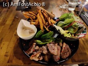 După puțin timp am primit și mâncarea. Porții măricele, prezentare faină. Burgerul băgat într-o chiflă cu semințe, acompaniat de salată, roșii, brânză, kaiser și sosuri delicioase, precum și de chipsuri de cartofi și încă un bol cu salată. Porția cealaltă cuprindea fâșii de friptură, cartofi dulci prăjiți și presărați cu parmezan, ardei iuți prăjiți, salată și un sos de usturoi. Le-am savurat îndelung, toate erau absolut delicioase; evident, stropindu-le din când în când cu apă sau cu vin.