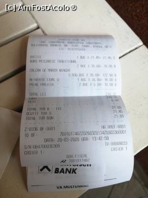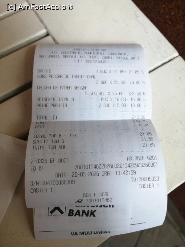 Am ales o masă, a venit imediat chelnerul cu meniurile. Am studiat puţin meniul şi am comandat 2 borşuri de crap şi o porţie de calcan de Marea Neagră. Ciorbele au venit repede dar peştele nu era proaspăt şi nici borş nu avea destul… nu mi-a plăcut. Lângă ciorbă a adus ardei, smantană şi cred sos iute – nu am încercat, paine prajită. Eu am comandat o bere heineken pe care am băut-o până a adus felul doi – pestele prăjit pe plită. Am stat cam 35 minute pană a adus peştele.