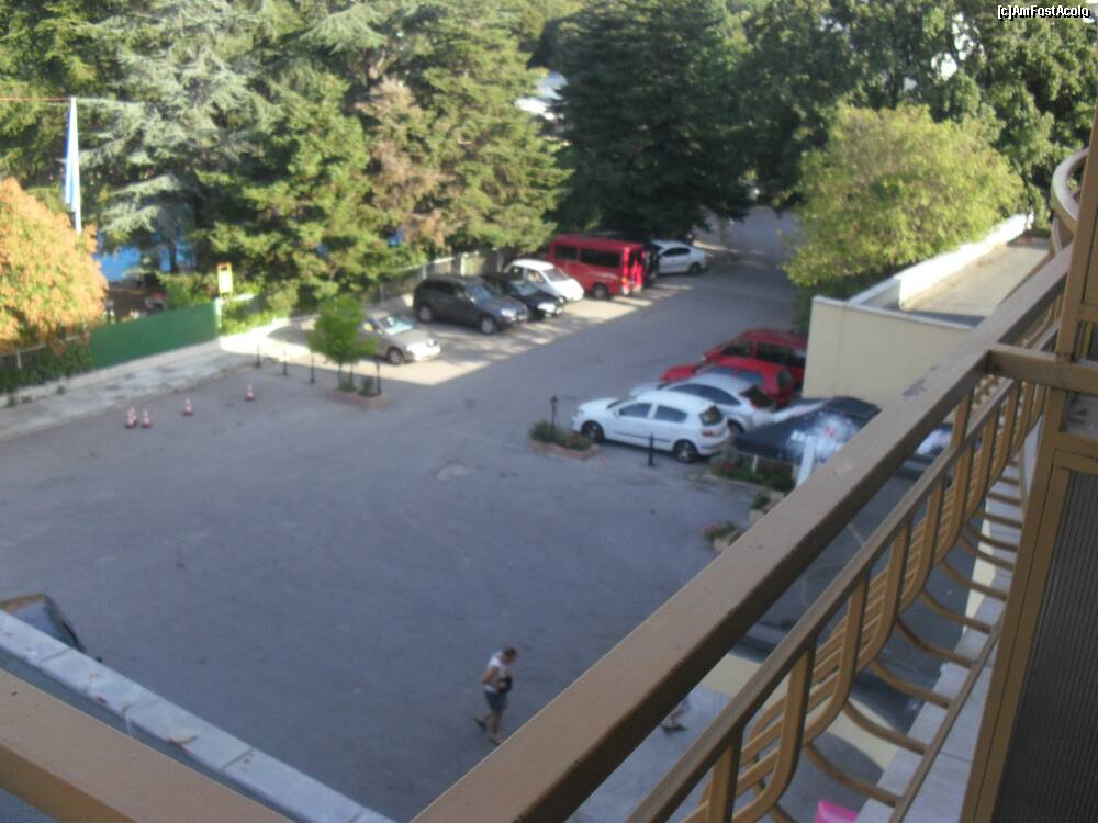 [P12] vedere din balcon, intrare in hotel si parcarea, in fata printre copaci se vede piscina