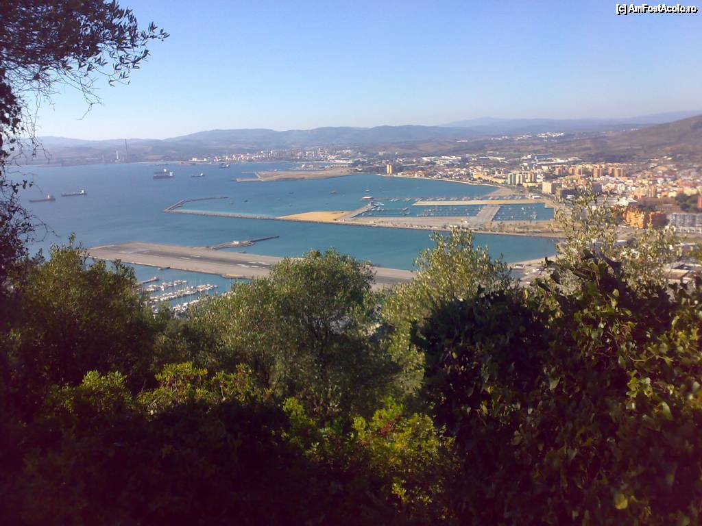 [P04] De pe stanca Gibraltarului. Jos este pista aeroportului, dincolo de ea este Spania. Cand vine avionul se pune rosu la sosea. Am stat la stop sa treaca o hudubaie de Boeing pe la 20 de metri de noi.