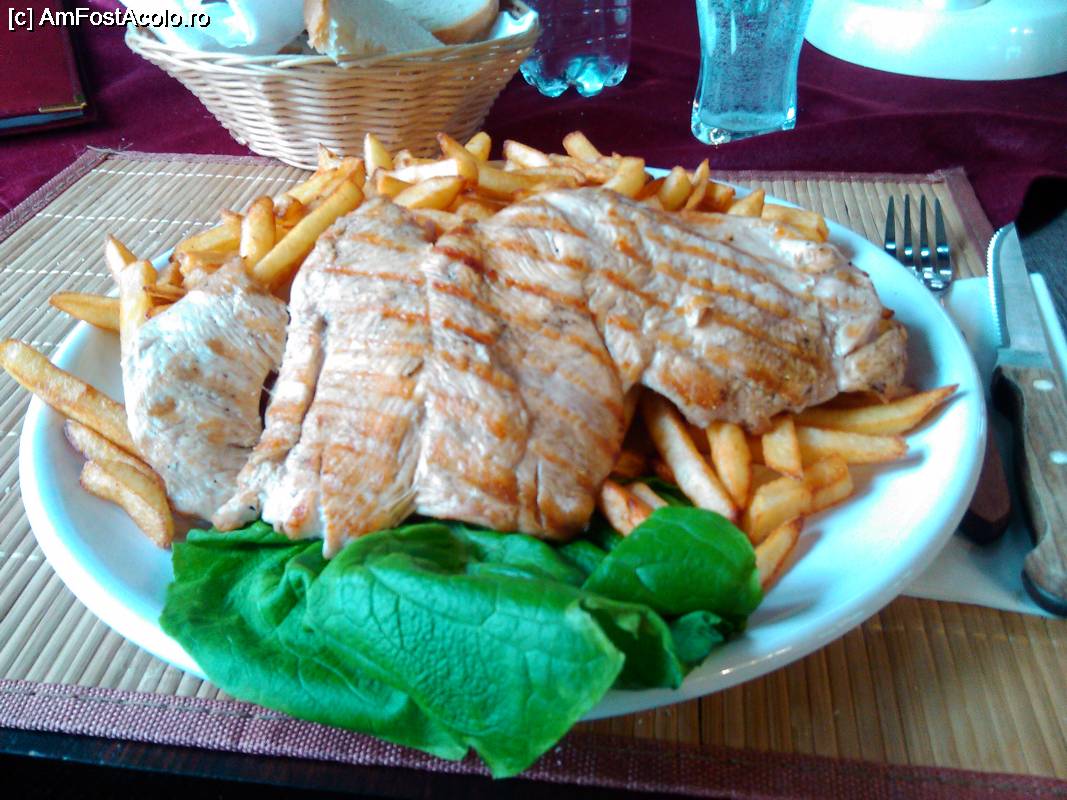 [P20] Apoi, soseste repede si gratarul de pui, cocotat pe un munte de cartofi prajiti, care, cu greu isi mai gasesc loc in farfurie