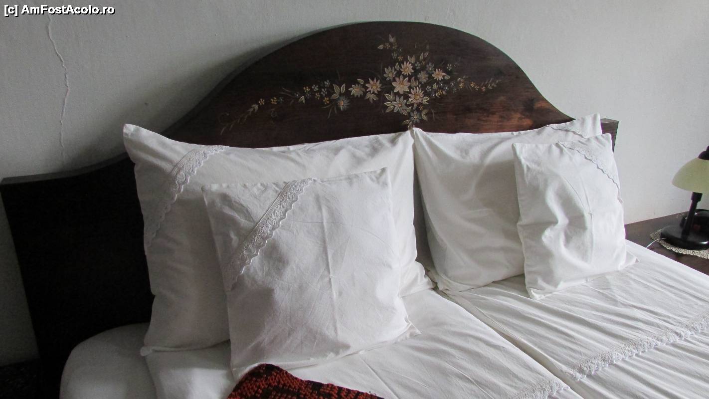 [P12] Detaliu cu tăblia pictată a patului și frumoasele perne cu dantelă