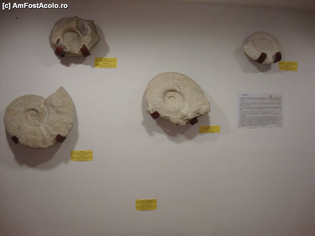 [P78] Pe un perete sunt expuse câteva cochilii de amoniți fosilizate.
