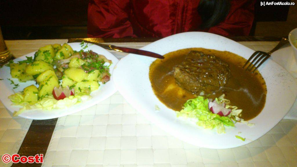 [P28] Friptură de vacă cu sos vânătoresc, alături de cartofi natur
