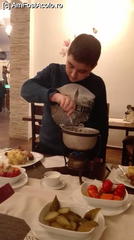 [P13] un preparat specific locatiei:carnita de vitel sau purcel, servit la ceaun, sub care arde focul pana consumi preparatul, pentru a se mentine mereu cald.