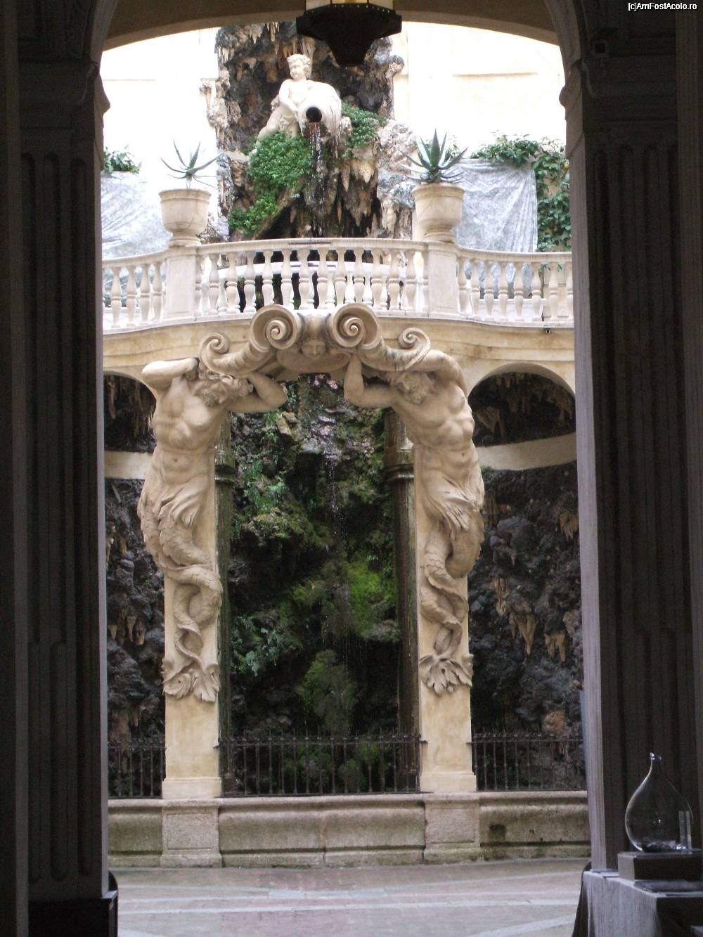[P01] Fotografie din curtea interioara a Palatului Podestà situat in Via Garibaldi. Acesta este un "ninfeo" adica un edificiu sacru ridicat pentru o Ninfa. Ca in toate edificiile de acest fel si aici apa este prezente. In partea de sus a fotografiei se observa statuia unui copil din a carui vas curge apa