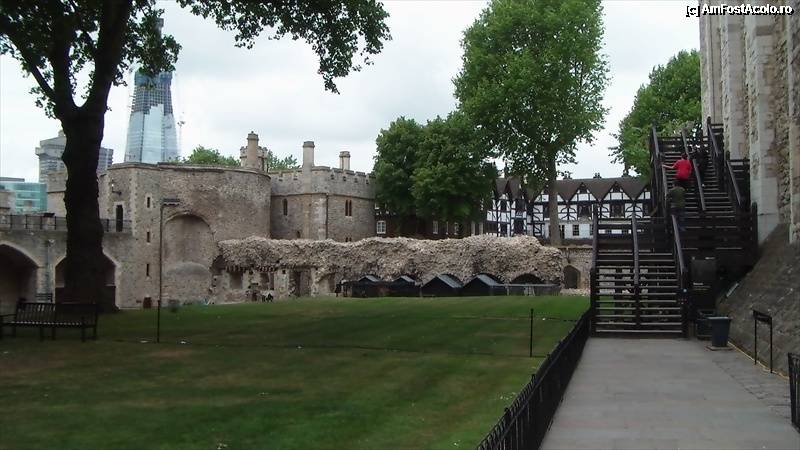[P23] Dupa Crown Jewels am mers la White Tower. Se urca pe aceste scari pentru a se putea intra. Christopher Wren a facut unele modificari la turn prin secolul 17. Pe fundal se vad custile corbilor iar cel mai in spate pe stanga, se vede blocul nou, care acum e in constructie, mai inalt decat Canary Wharf.