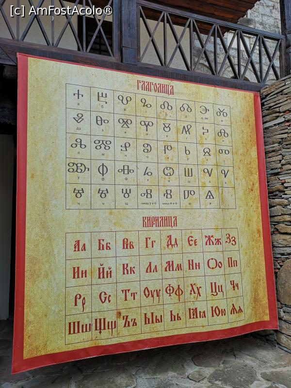 [P21] Mânăstirea Troian - în curte, un panou ce prezintă corespondența între vechiul alfabet glagolitic și cel chirilic, actual