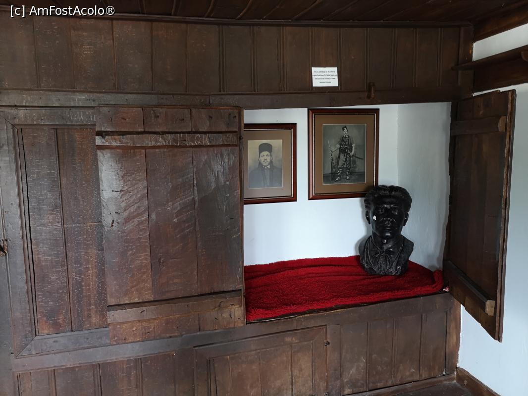 [P26] Mânăstirea Troian - nișa în care dormea Levski; în dreapta bustul său, pe pereți fotografii cu el; în tavan e o trapă ce duce în pod, pe unde a scăpat de turci