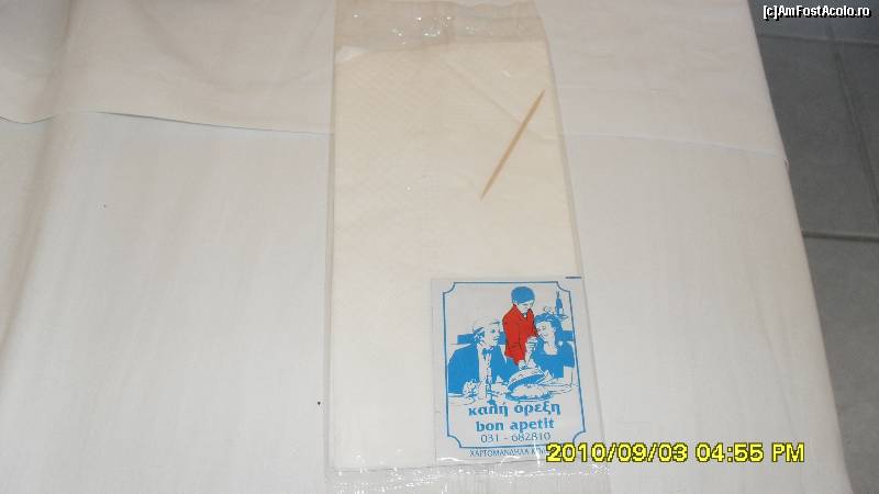 [P200] asa arata servetelul : e si o scobitoare si un servetel parfumat, in punga sigilata, la taverna panorama Kalamitsi