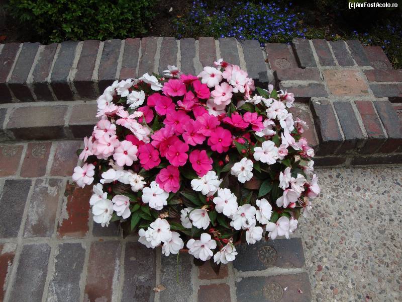 [P22] Muzeul memorial Frederic Chopin de la Żelazowa Wola : ghiveci cu aranjament floral pe una din aleile parcului