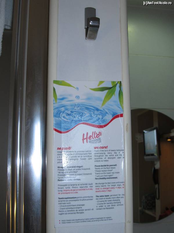 [P18] Hello Hotels- stickerul de langa dus care explica frecventa schimbarii prosoapelor si lenjeriei