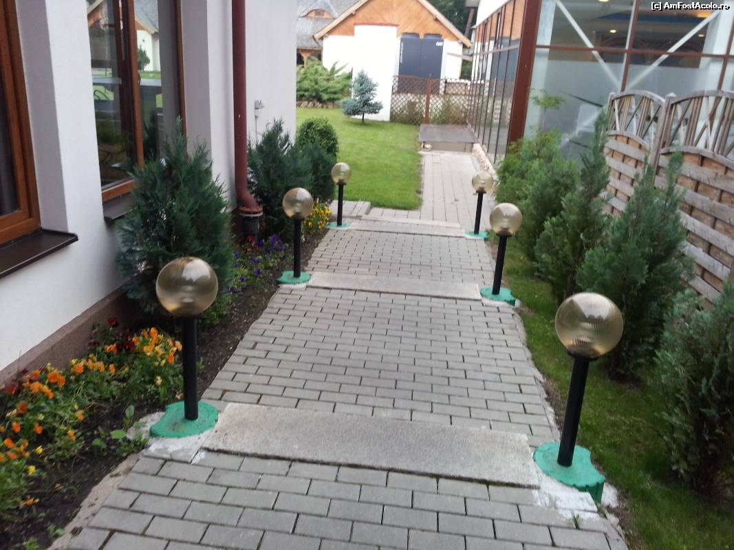 [P11] Iesirea din hotel catre curtea posterioara. Alee din dale strajuita de felinare si arbori de tuia