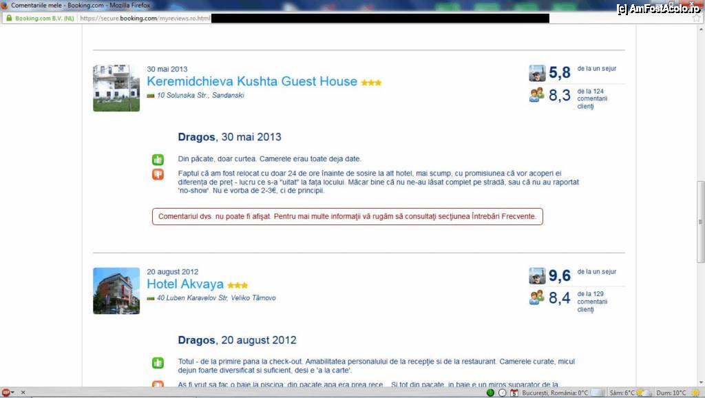 [P06] Am găsit în profilul meu de pe booking.com și comentariul nepublicat despre care vorbesc în articol. Se poate vedea că nu au motivat nepublicarea, doar au notat sub el că (vezi Doamne) „Comentariul Dv. nu poate fi afișat”. DE CE??? Pt. că spune adevărul???