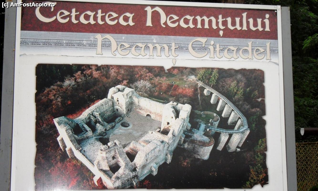[P02] Imagine aeriană spectaculoasă a Cetăţii Neamţului pe unul din panourile turistice. Imaginea cetăţii datează dinainte de ultima renovare. În stânga (patrulaterul) este fortul vechi muşatin, iar în spatele acestuia fortificaţiile adăugate de Ştefan cel Mare (zidurile exterioare şi podul de acces)