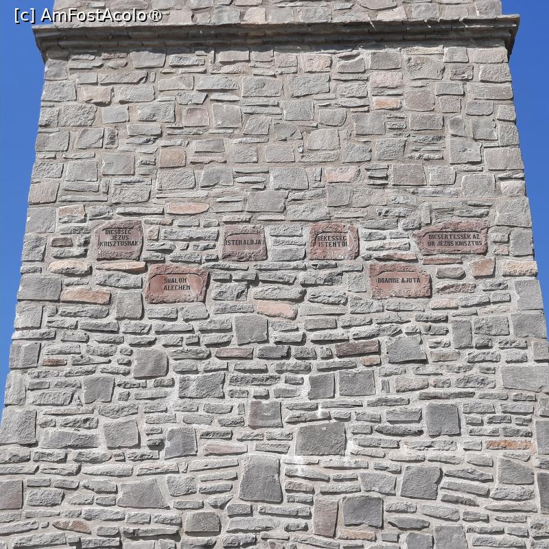 [P20] Bezidu Nou, jud. Mureș, Biserica Ecumenică, Turnul, Plăcuțele cu „DOAMNE AJUTĂ” și expresiile similare ale celorlalte religii din sat