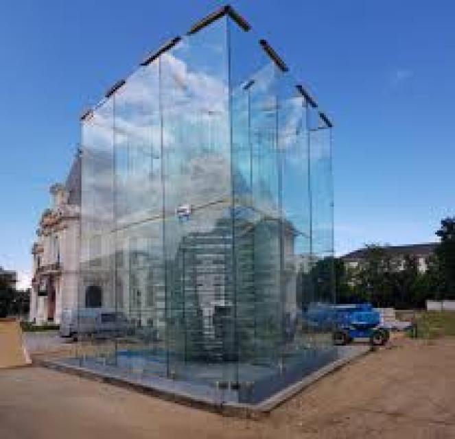 [P65] Craiova, Centrul „Constantin Brâncuși”, Prisma de sticlă, adăpost pentru Ovoidul realizat de arhitectul Dorin Ştefan