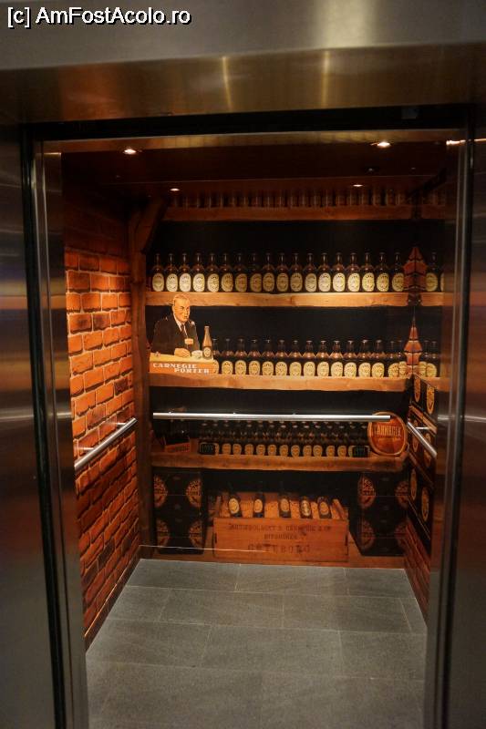 [P14] Interiorul liftului cu tapetul reclamă la berea Porter.