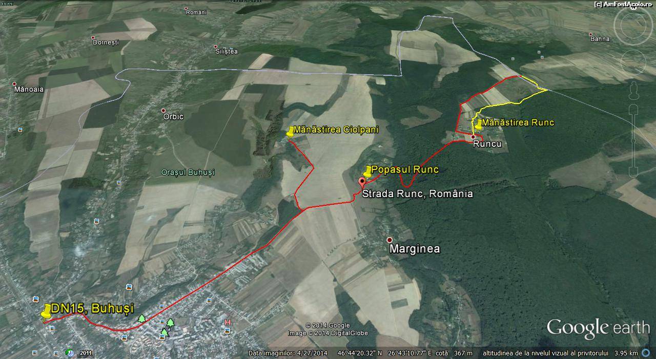 [P01] Perspectiva traseului. Galbenul marchează porțiunea inaccesibilă rutier (circuitul din dreapta imaginii se poate face însă lejer pe jos). Pentru a vă putea bucura pe deplin, lăsați mașina la Popasul Runc și mergeți pe jos inclusiv pînă la mănăstire (unde totuși securitatea mașinii ar fi mai ridicată)