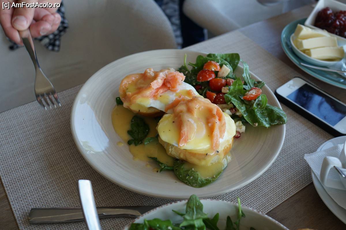 [P08] La micul-dejun: oua Royal servite cu salata de rucola si rosii cherry.