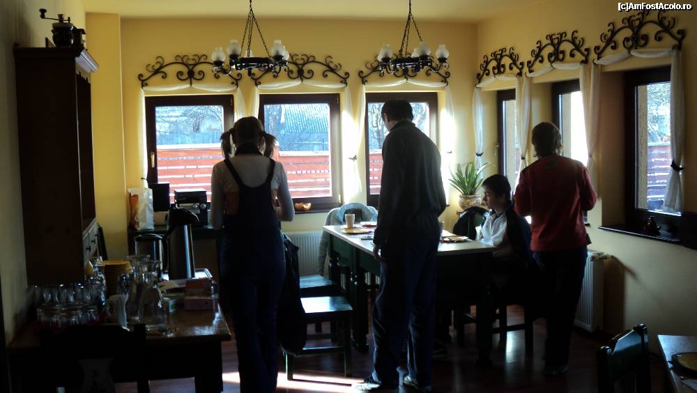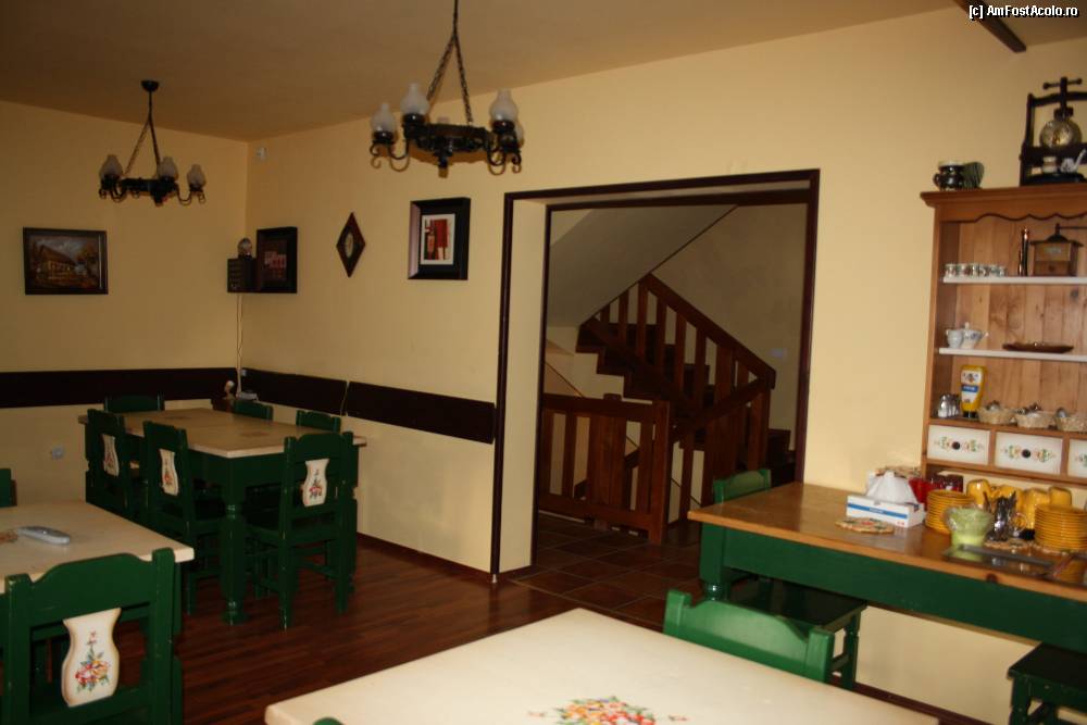 [P09] Aceeasi sala pentru micul dejun, fotografiata din alt unghi. Usa dadea spre curtea interioara, tot acolo se afla si o terasa amenajata cu mese si scaune.