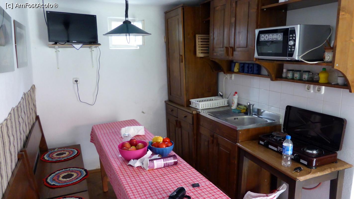 [P11] Interior ”sufragerie” (detaliu) al Casei Zabos. Bucătăria este dotată cu de toate, inclusiv plită aragaz și frigider (nu apare în imagine). Pe perete, un TV LCD cu multe posturi