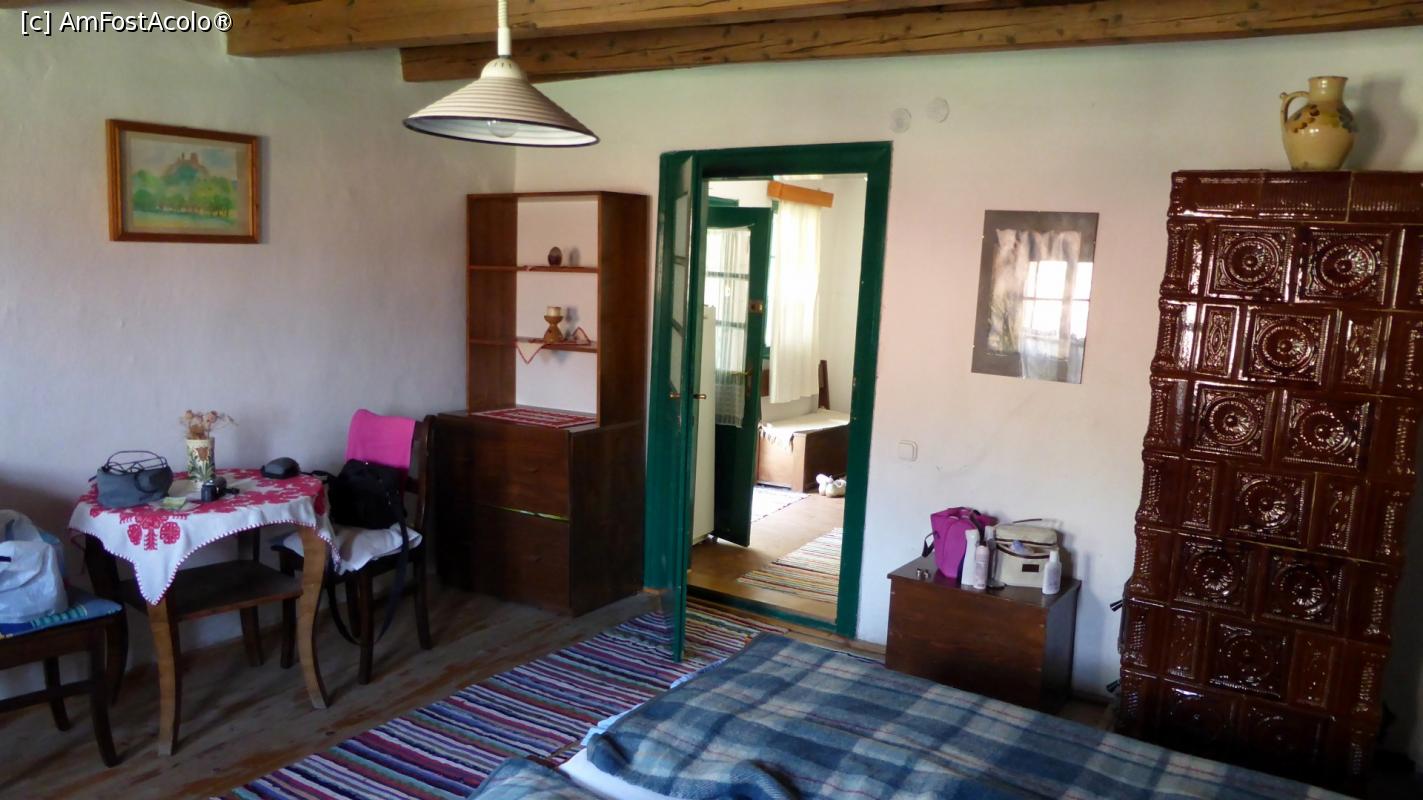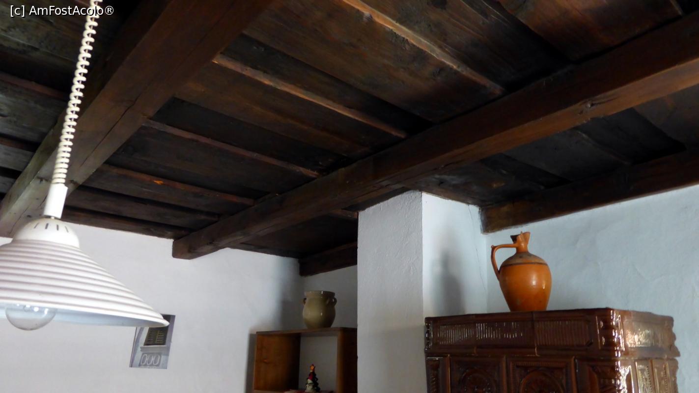[P07] Detaliu din camera mare (folosită de noi) a Casei Zabos. Se pune mare accent pe păstrarea tradiției (podele de lemn, tavan cu grinzi și scânduri de lemn, covoare ”din cârpe”). Tabloul din stânga reprezintă Cetatea Colțești. Pe masă și pe rafturi sunt mileuri tradiționale...