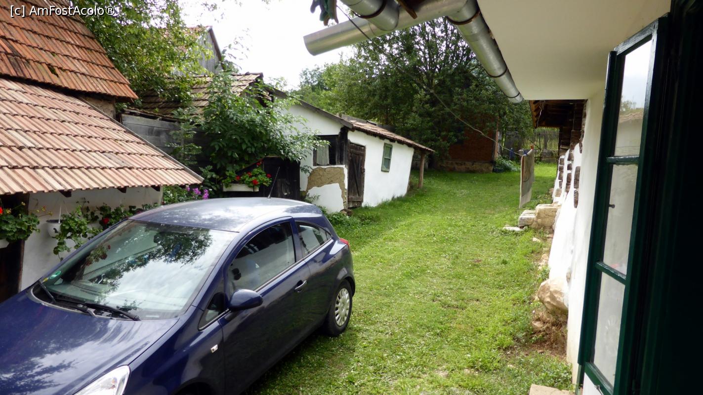 [P15] Detaliu din curtea Casei Zabos. În partea dreaptă se vede o părticică din casa istorică iobăgească (datând din 1749), iar în spate, în spatele unui gard cu poartă, grădina cu pomi (și grill). În partea stângă sunt diverse anexe gospodărești (înainte de 2001 curtea a fost