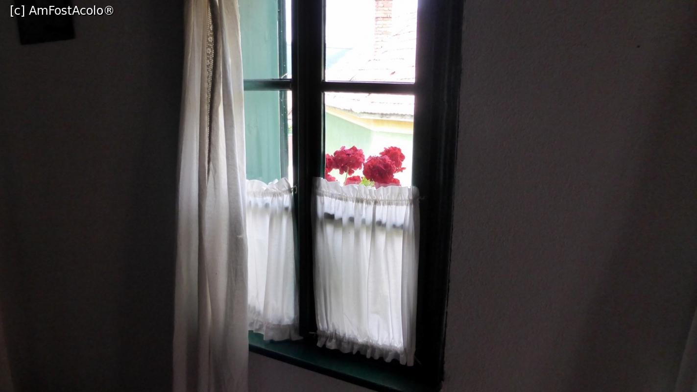 [P16] O fereastră (originală din sec. XIX) cu mușcate roșii și pedeluțe tradiționale la Casa Zabos