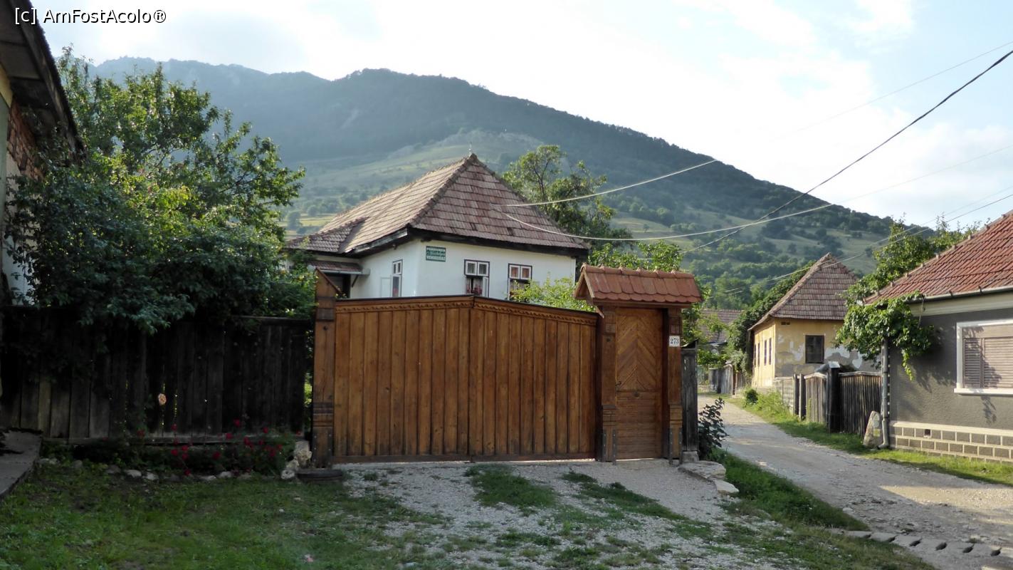 [P06] Detaliu din curtea Casei Zabos. În stânga, prima casă este cea istorică, de iobagi, datând din 1749! (refăcută în 2008-2010). Urmează Casa Zabos și poarta de lemn. În fundal se văd Colții Trascăului (Piatra Secuiului)