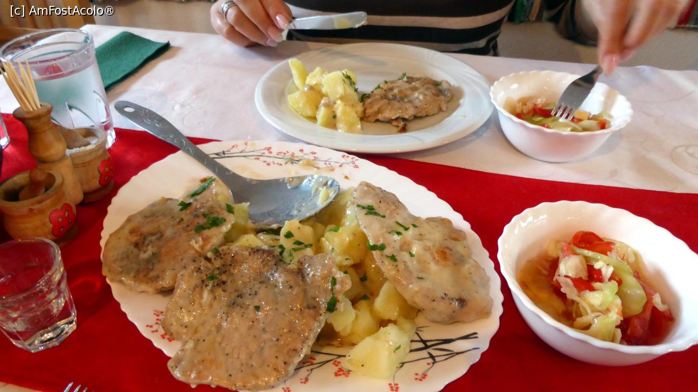 [P20] Friptură cu cartofi în sos puțin picant. Porția pentru două persoane alături de paharul cu palincă.