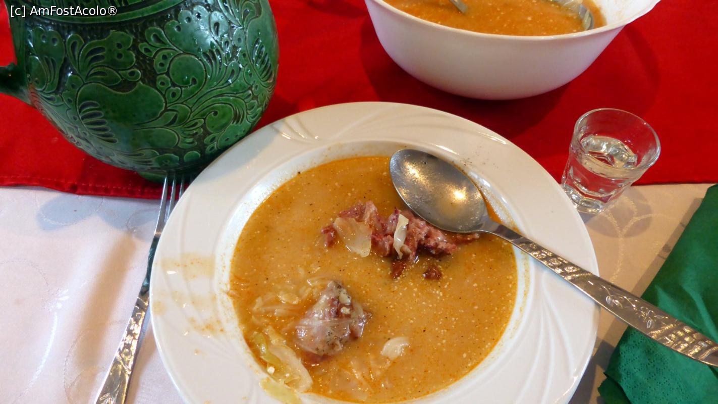 [P22] Ciorbă de varză cu afumătură alături de paharul cu palincă și de cana tradițională cu apă de la izvor