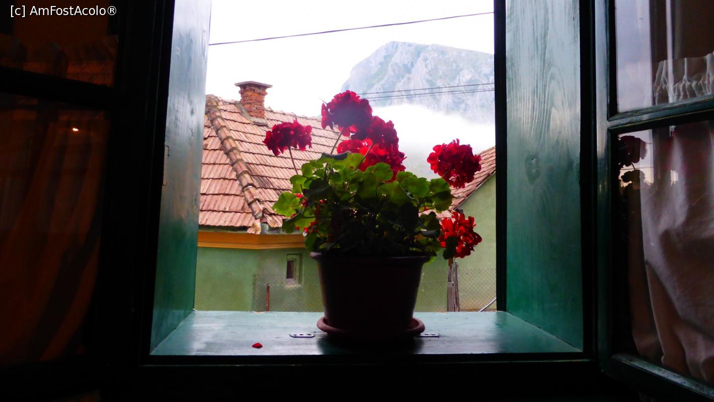 [P09] Fereastră cu mușcate în fereastra Casei Zabos. În depărtare se văd Colții Trascăului deasupra ceții de dimineață ce acoperă valea