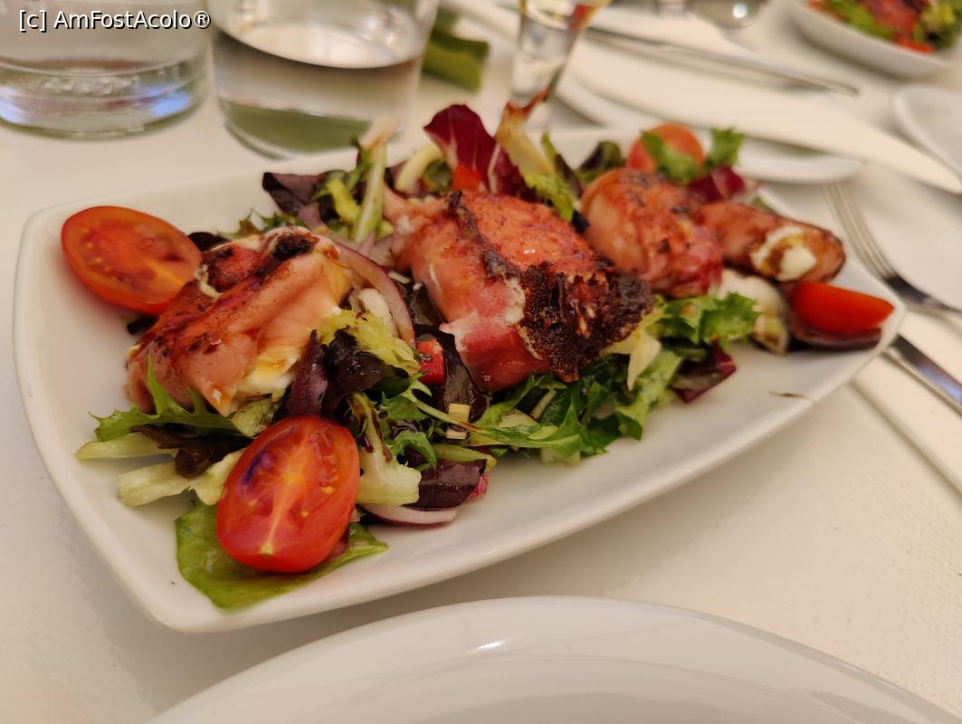 [P14] Restaurant Sa Vinya; brânză de capră învelită în jamon, pusă pe grătar, plus salată