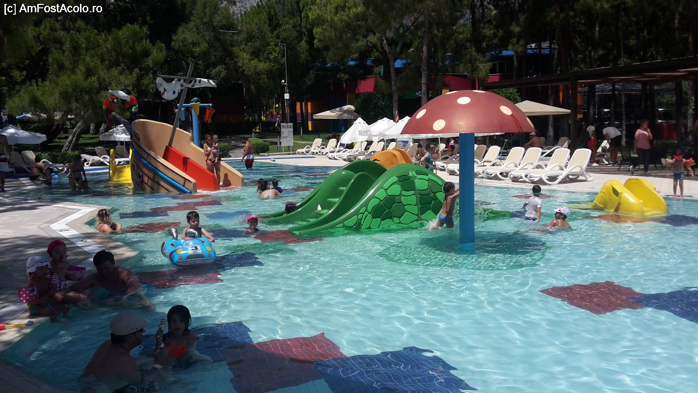 [P34] O zonă care mi-a plăcut foarte mult destinată copiilor mici cu piscină topogane şezlonguri, mese de ping- pong. restaurant şi amfiteatru şi în spate o zonă de căţărare prin copaci