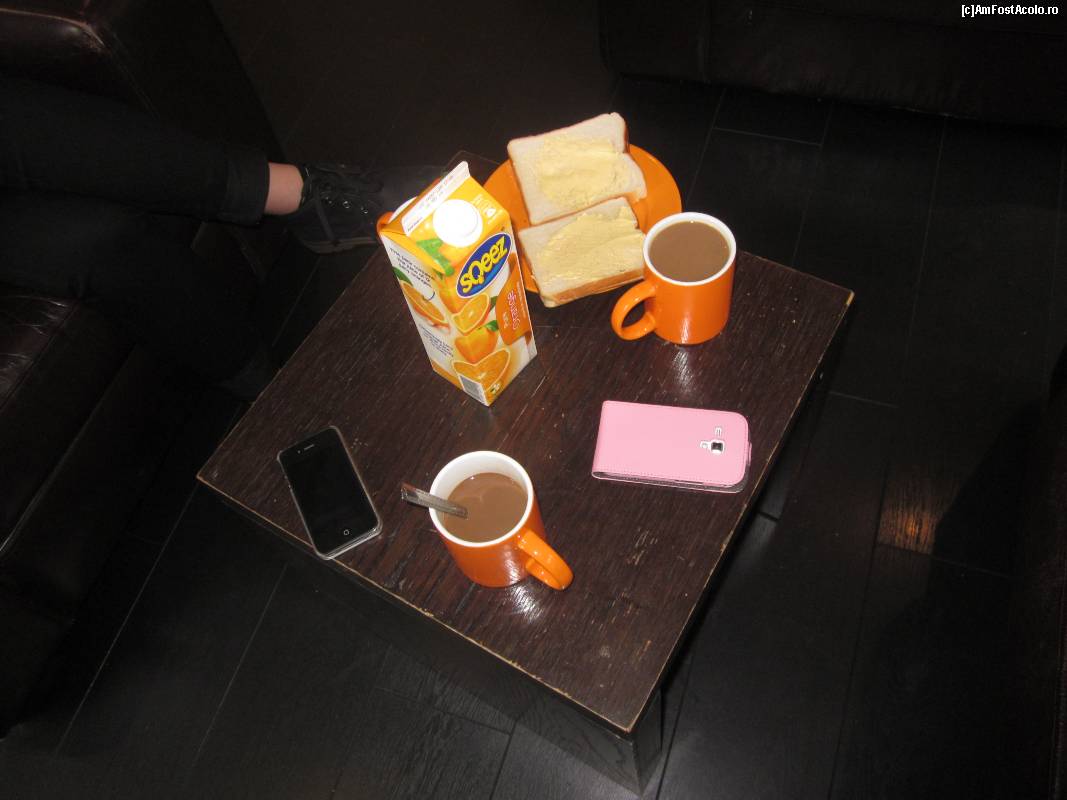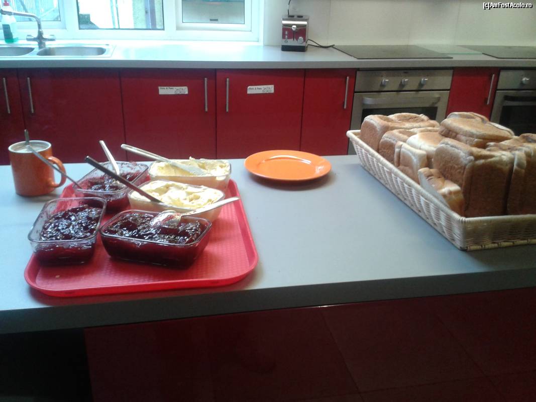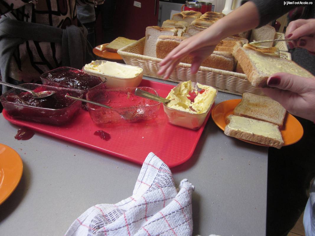 [P14] Mic dejunul de la Sleepzone. Totul la grămadă, în stil "rucsăcesc". Jelly, margarină, pâine, în plan îndepărtat un toaster din care funcționa doar jumătate.