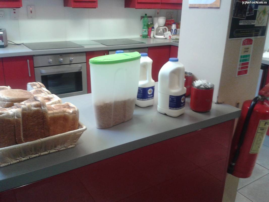 [P15] Cutia cu cereale, bidoanele cu lapte muls de la văcuțe irlandeze, o cutie cu zahăr-plicuri și, imediat în colț, cutia cu cafea solubilă.
