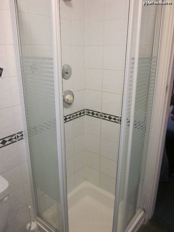 [P08] Cabina de duș. Din păcate, nu am mai făcut altă poză cu aceasta pentru că mă 'nervasem, dar sus este capul de duș fix-fix în perete. Mi-a mâncat sufletul... Deasupra sistemului de reglaj al apei se află butonul abominabil pe care trebuia să-l apăs la 10 secunde... altfel rămâneam fără apă.