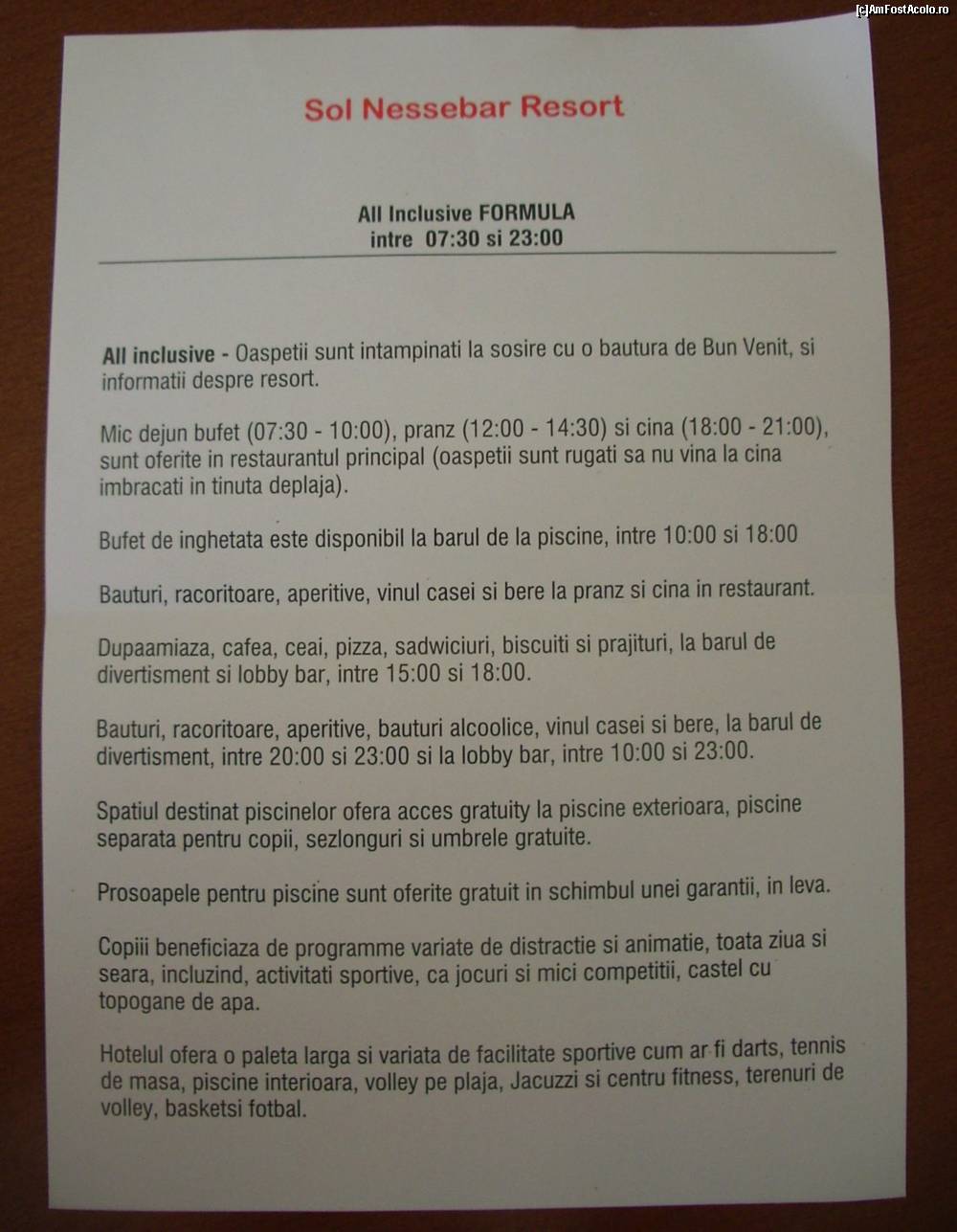 [P01] Manifestul de bun-venit si prezentare ce se ofera la cazarea in Hotel Sol Nessebar Mare pentru turistii romani.