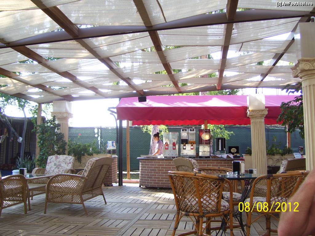 [P23] ... in continuare, barul are dozator cu lapte, suc si cafea europeana, alaturi de suportul pentru cesti si farfurioare. Cafeaua turceasca se prepara separat, dupa tipic: nisip, ibric special, cesti mici. Coloanele care sustin acoperisul amintesc de Colosseum-ul din Roma.