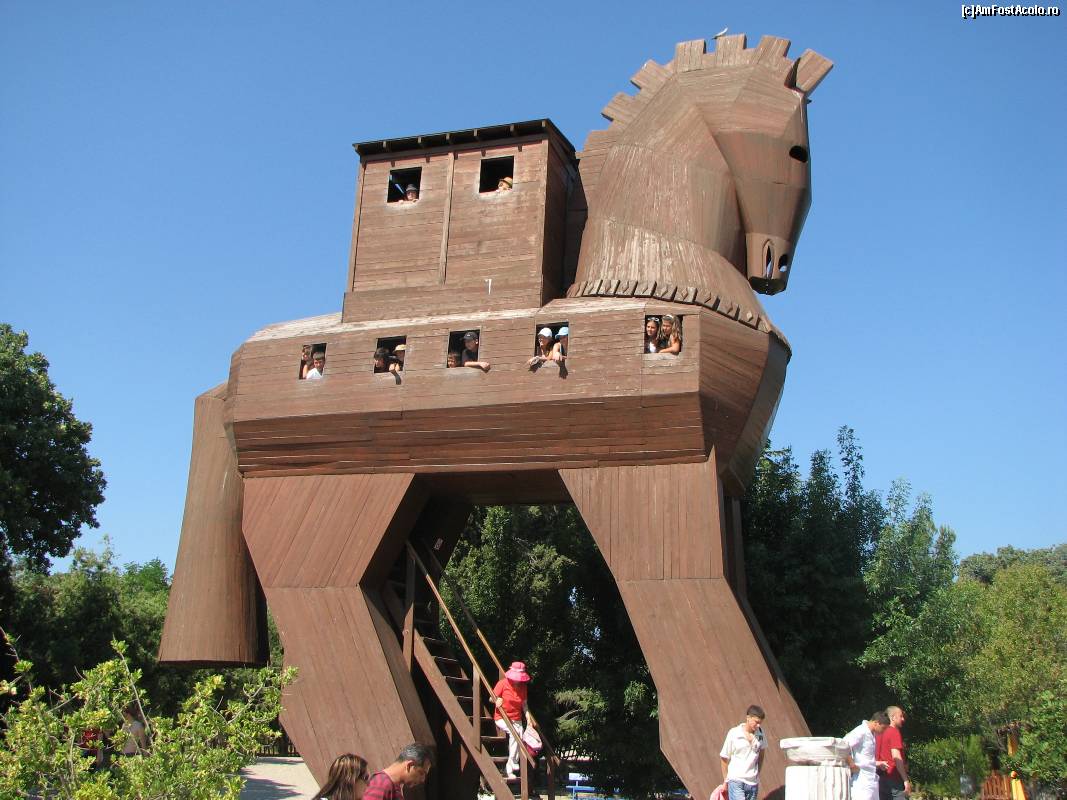[P26] Calul troian artizanal de la situl istoric Troia, plin cu turisti pentru foto.